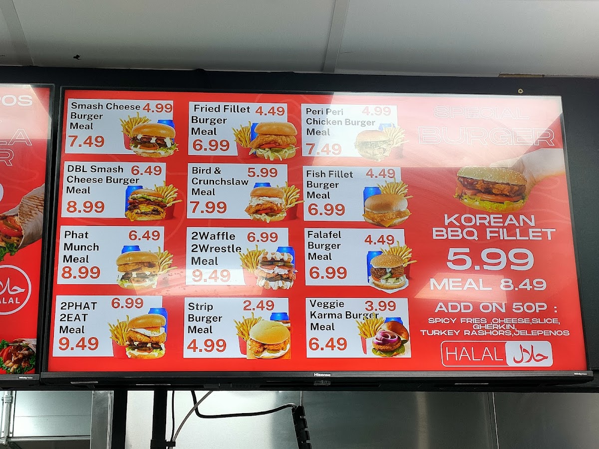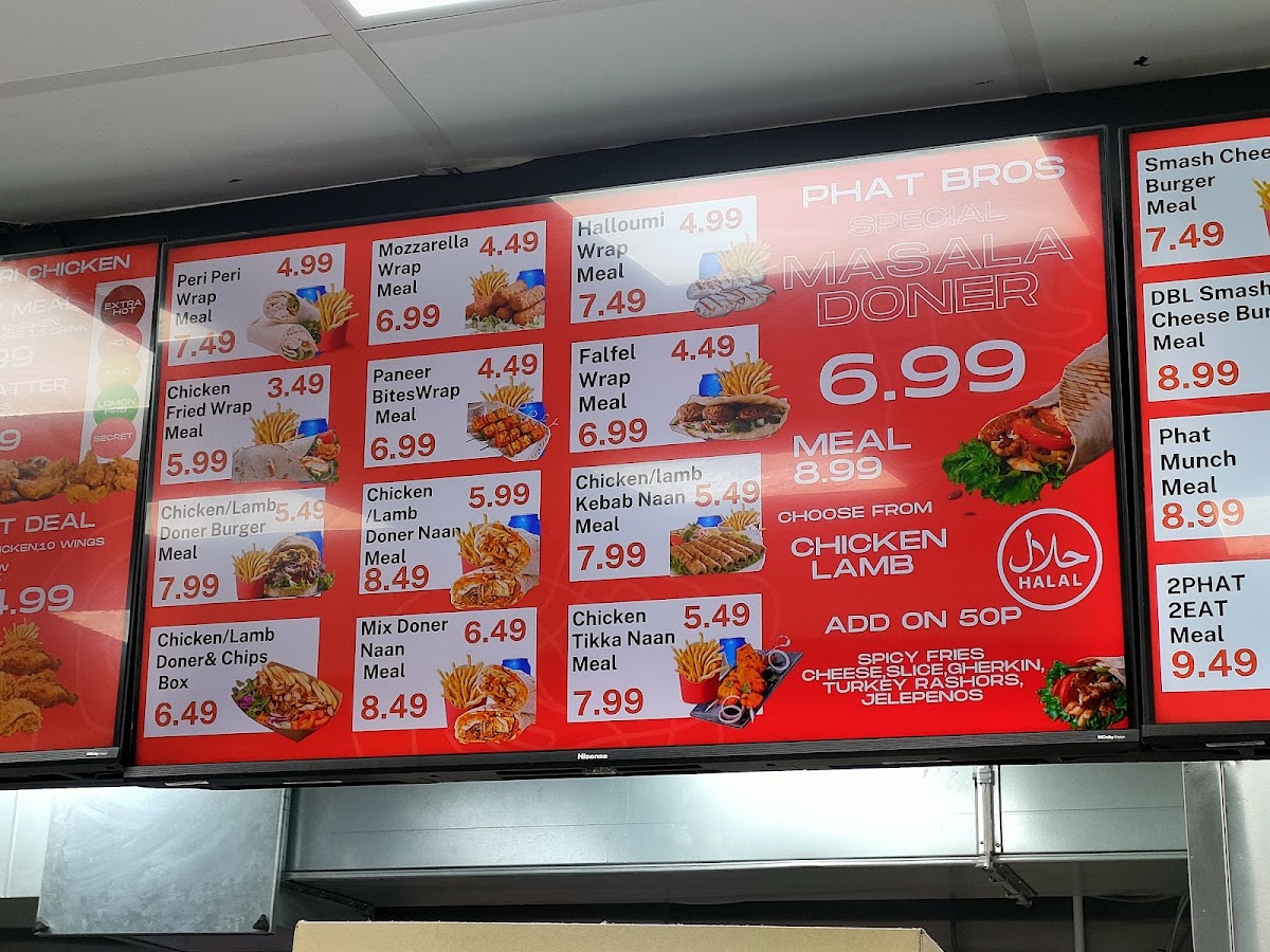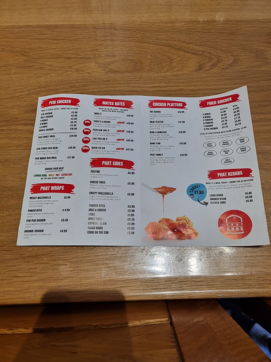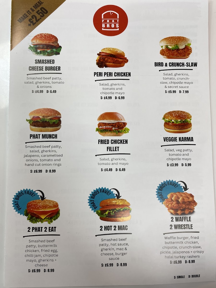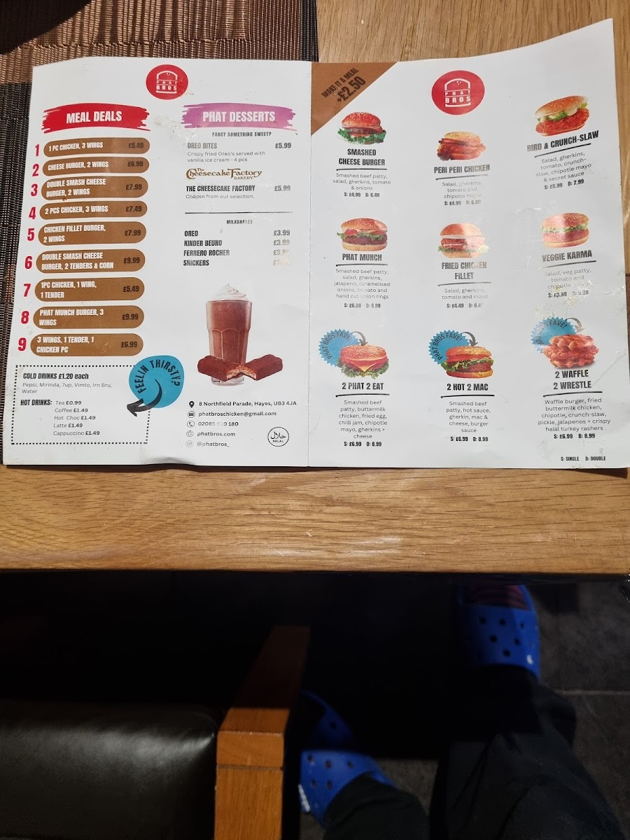 The menu at Phat Bros offers a variety of takeout options primarily focused on hearty meals and snacks suitable for lunch, dinner, or casual dining. The selection includes several meal deals combining burgers, chicken wings, wraps, and sides, providing convenient options for a quick and filling takeaway experience.